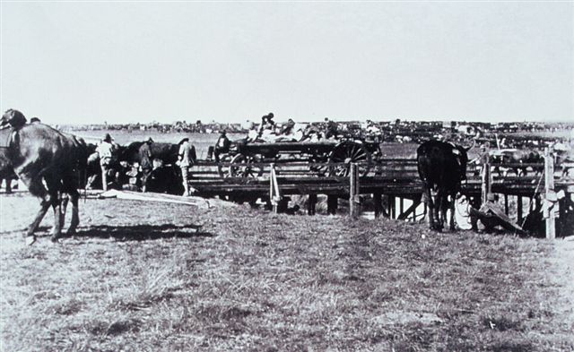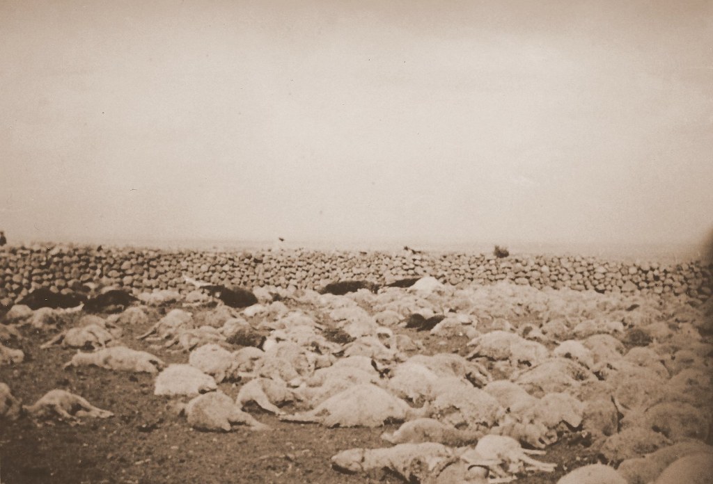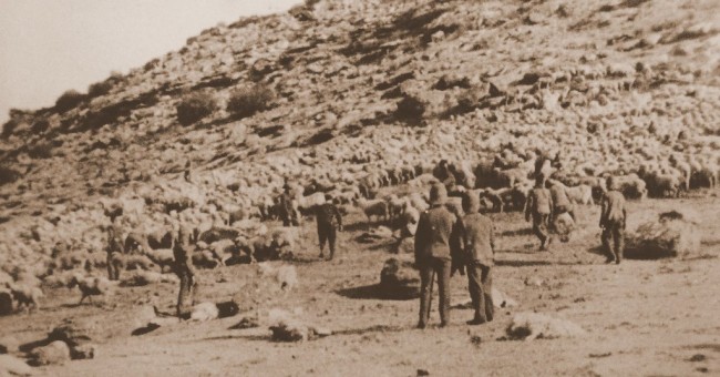 This picture shows a herd of sheep being driven together so that they could be killed. Sheep numbering in the millions were machine gunned, or chased into the long grass whereupon the grass would be set alight, or simply bayoneted to death.'