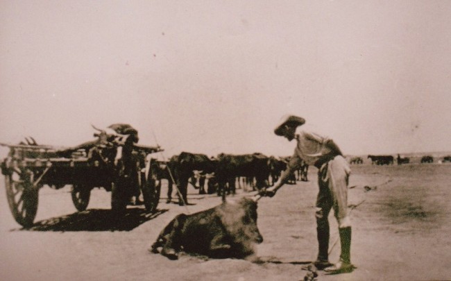 Camp diaries, memoirs and letters make frequent mention of how the draught animals suffered during the forced convoy marches to the concentration camps. There was often a great sense of urgency to reach a safe point of destination, which caused the columns to have to move at high speed. Since oxen are powerful draught animals, but lack speed and stamina to continue over long distances without adequate rest and grazing, many animals became weakened. In camp memoirs it is often recorded how exhausted cattle were shot as soon as they could not move any longer. The above picture presents an illustration of this fact. Sometimes the draught oxen were shot at the yoke, in which case the team was forced to continue so that the ox waggon would roll across the stricken beast's back. From written camp memoirs one gets the impression that the women and children on their way to concentration camps could still understand their own captivity, but they found the cruelty towards animals particularly disturbing.