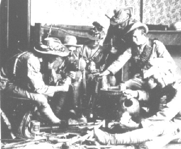 Rimington's Scouts are having a brew in the looted interior of a Boer farmhouse. Pianos, harmoniums and furniture were frequently broken up to be used as firewood by soldiers on the highveld, where wood was scarce. The photo caption read: "Rimington Scouts enjoying lunch in a Boer home wrecked by kaffirs. Jaasfontein, S.A." TAB1283